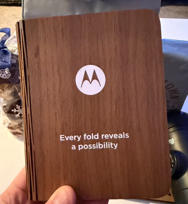 而在这份邀请函礼包中,包括了一个印有“Every fold reveals a possibility”字样以及摩托罗拉 LOGO的书,有兴味的是,这本书还选择了木制四肢搭钮用来张开与折叠,这难免让人人联思到,是不是摩托罗拉也要推出大折叠手机了?而这款手机发布的日历,很有可能就在1月6日召开的联思科技宇宙四肢。