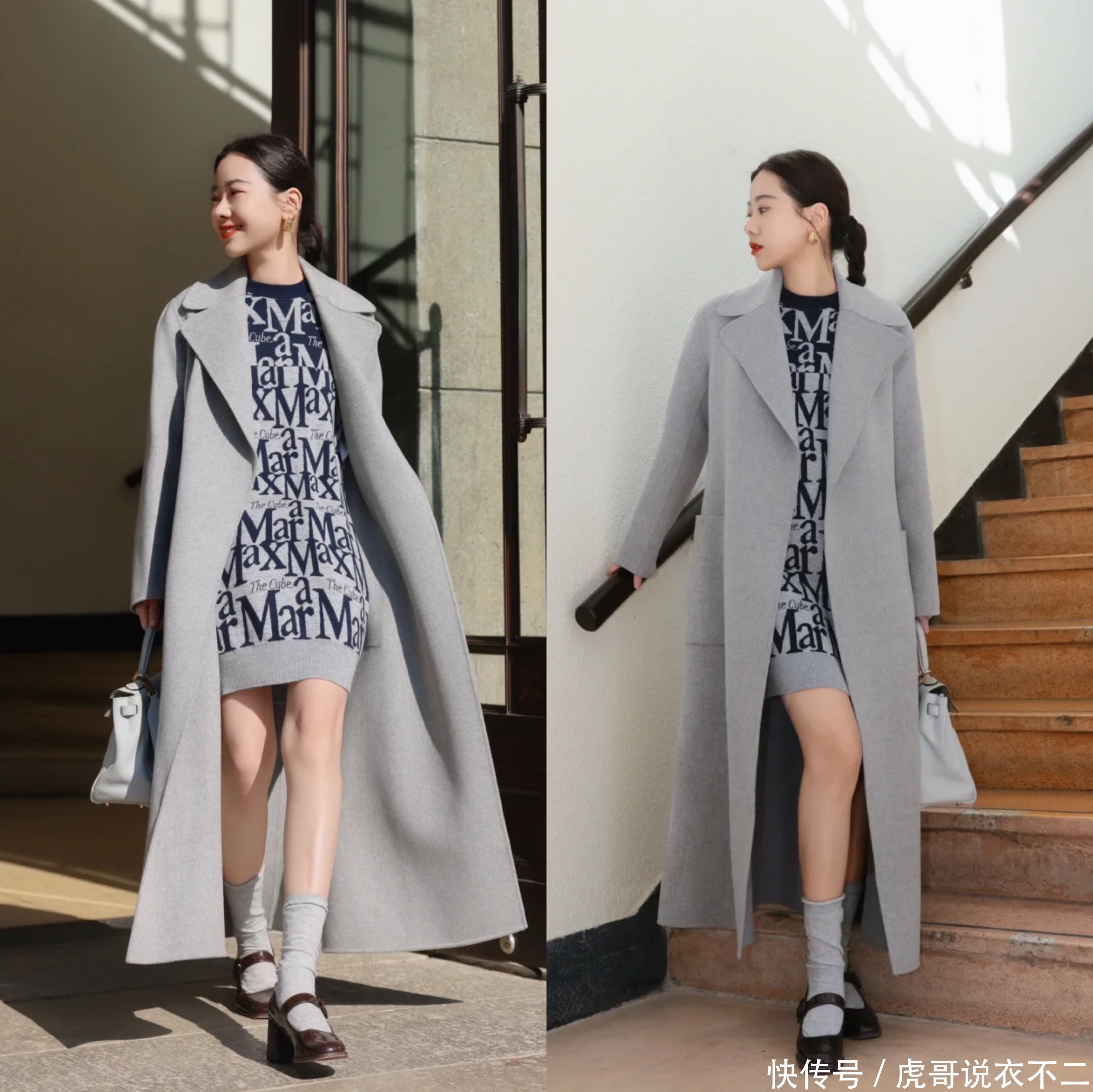 灰色长款大衣,内搭灰色字母提花诚实包臀裙,外长内短的穿搭,不仅突显举座造型的端倪感,还能很好的遮肉显瘦,气质非常高档。
