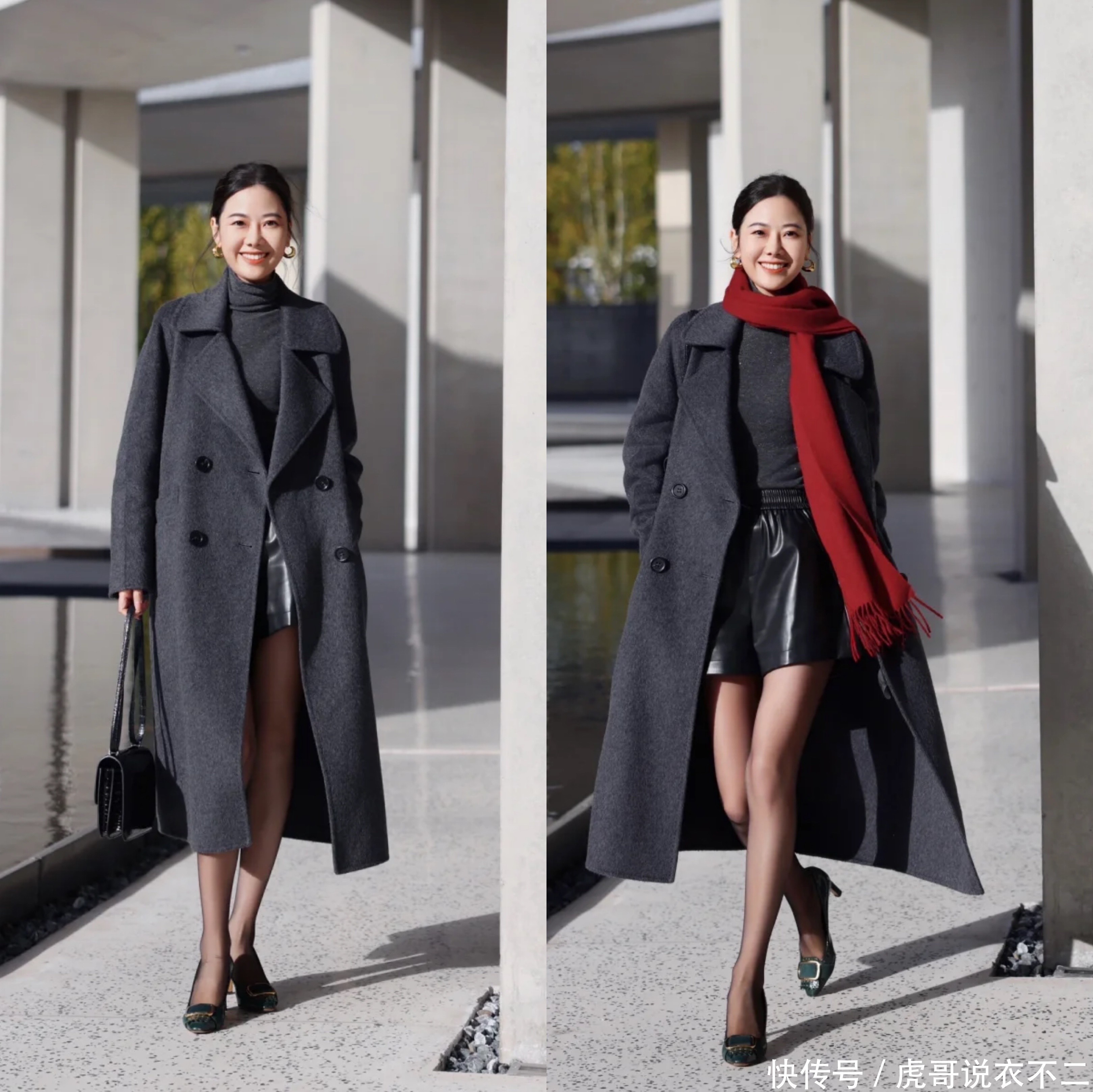收受一条皮质短裤搭配长款大衣,玄色丝袜或者打底裤+尖头小高跟,既概况展现出修长的双腿,又概况挣扎阴凉。