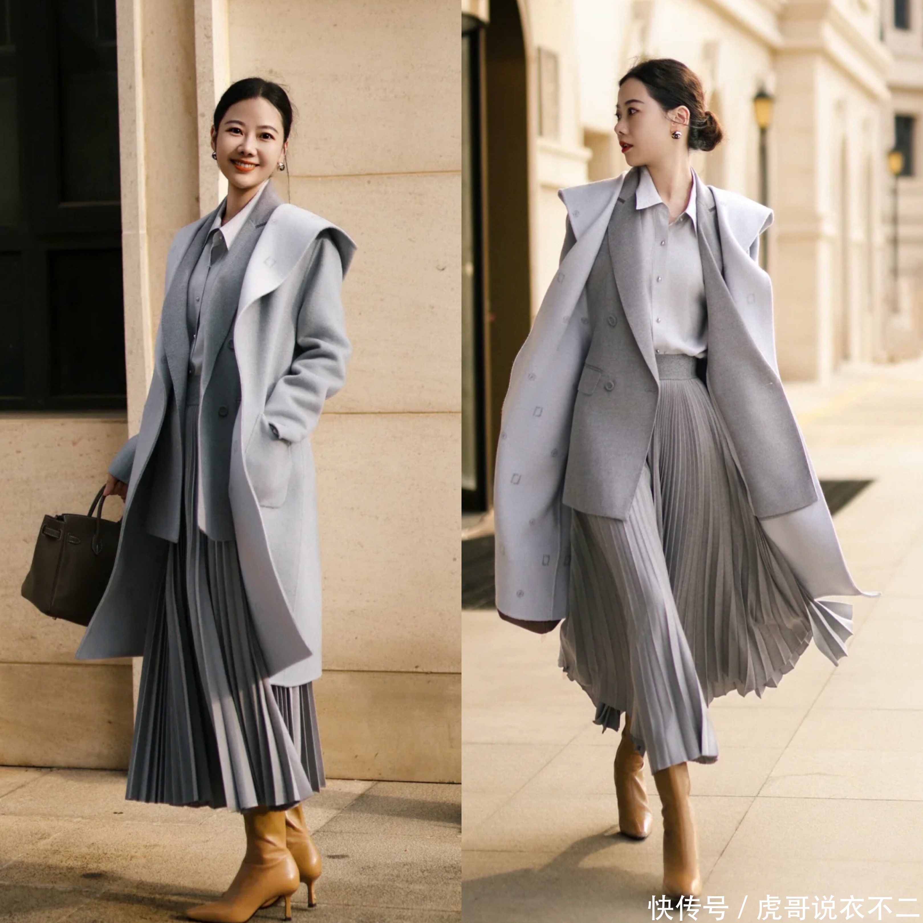 木子博主收受的是灰色长款大衣,搭配灰色百褶半身裙,内搭收受了浅灰色衬衫叠穿灰色小西装,周边色系搭配从简高档,叠穿丰富了端倪感,非常值得鉴戒。