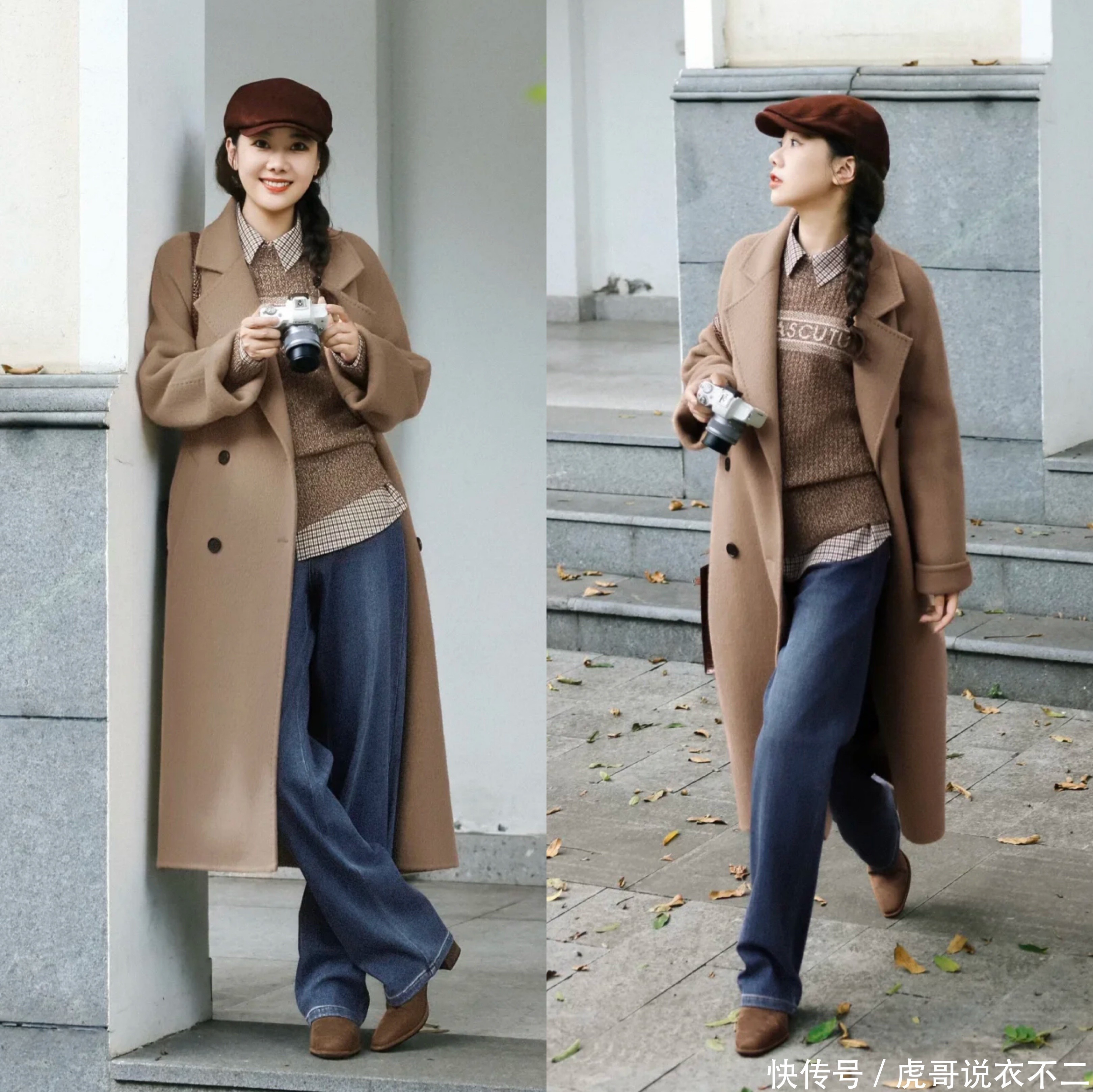 木子博主收受的是驼色大衣内搭同色毛衣叠穿格子衬衫,下半身收受的是宽松的纵贯牛仔裤,举座造型闲逸又清静。