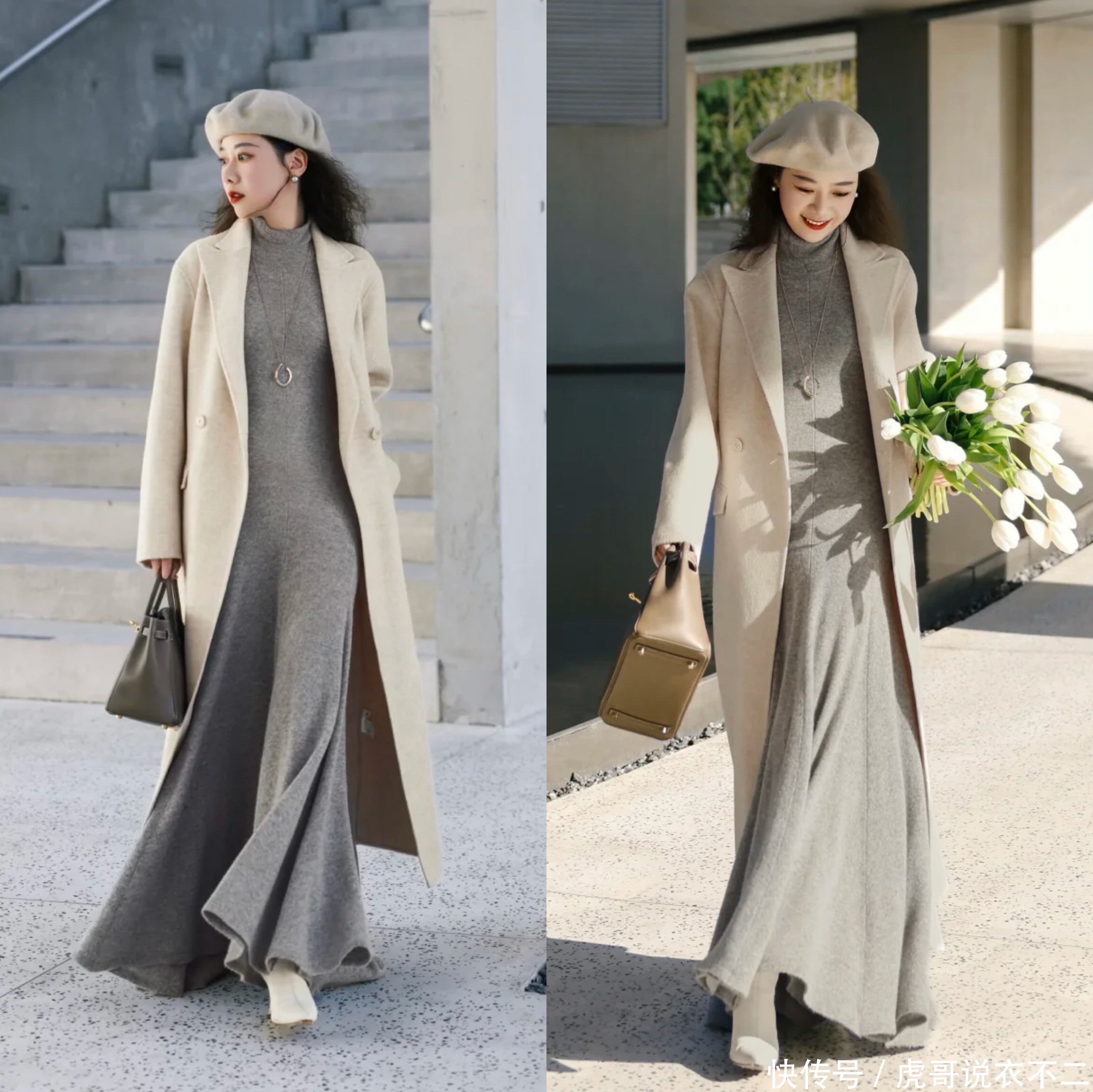 1、大衣+裙装:柔好意思与优雅的齐全和会